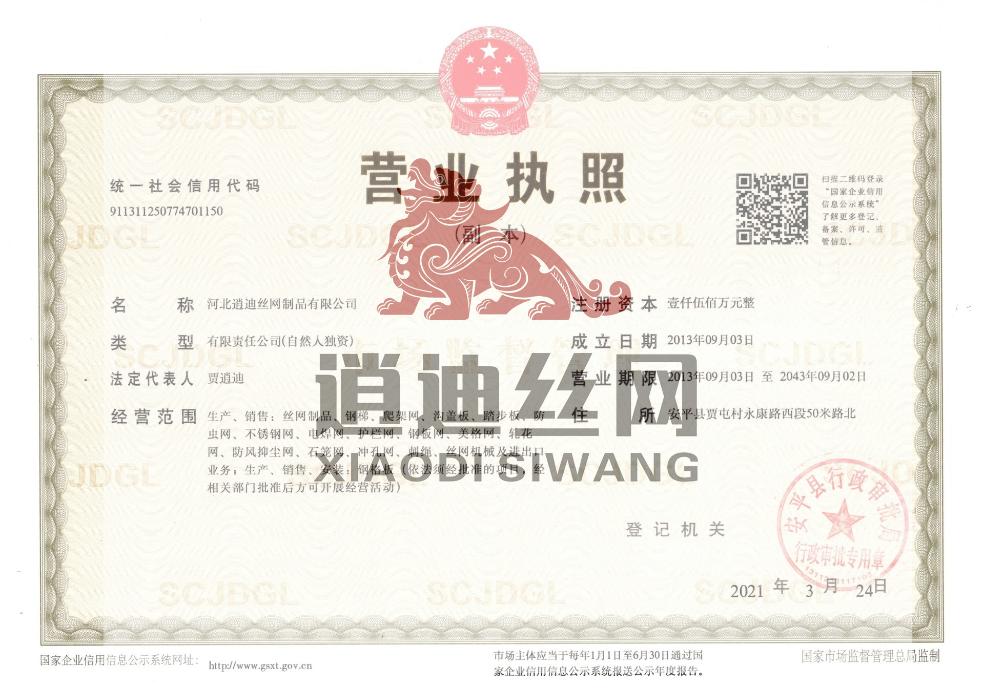 河北逍迪絲網(wǎng)制品有限公司誠(chéng)信天下,誠(chéng)信是我們公司一個(gè)原則問(wèn)題不可撼動(dòng)的,以心中有誠(chéng)信的思想結(jié)交五湖四海的朋友,能達(dá)到雙贏是最好的,我們堅(jiān)信朋友多了路好走,我們公司都是老朋友多,我們一直是這樣做的。河北逍迪絲網(wǎng)制品有限公司成立于2013年注冊(cè)資本壹仟伍佰萬(wàn)整,主要生產(chǎn)沖孔網(wǎng),鋼格板,金屬防蟲網(wǎng),如實(shí)的實(shí)體廠家,是一家-研發(fā)-銷售-生產(chǎn)-安裝-售后一條龍公司,2019年通過(guò)了ISO 9001認(rèn)證管理體系符合GB/T 19001-2016/ISO 9001:2015標(biāo)準(zhǔn),同時(shí)通過(guò)了SGS認(rèn)證,擁有商標(biāo)版權(quán)2品牌,擁有一個(gè)著作版權(quán),河北逍迪絲網(wǎng)制品有限公司位于中國(guó)有名的(絲網(wǎng)之鄉(xiāng))安平縣,于天津,北京,雄安,石家莊相鄰,交通非常發(fā)達(dá),出口可以選擇天津港口非常近每天都有接貨送貨往返車輛,空運(yùn)可以選擇石家莊正定機(jī)場(chǎng),附近也有鐵路運(yùn)輸,當(dāng)?shù)剡€有兩個(gè)生態(tài)物流園區(qū)發(fā)往全國(guó)各地,我們沖孔網(wǎng)工廠生產(chǎn)設(shè)備有:普通沖壓機(jī),高速?zèng)_壓機(jī),自主研發(fā)小微孔沖壓機(jī),龍門沖,磚塔沖孔,重型沖孔機(jī),萬(wàn)瓦級(jí)別激光切割機(jī),3000W激光切割機(jī),焊接設(shè)備,折彎?rùn)C(jī),校平機(jī),剪板機(jī),精密校平機(jī),(對(duì)板面平整度要求苛刻的客戶群體0.5-0.2誤差)我們公司銷售市場(chǎng)沒(méi)有局限性國(guó)內(nèi)國(guó)外都供應(yīng),擁有出口權(quán)...